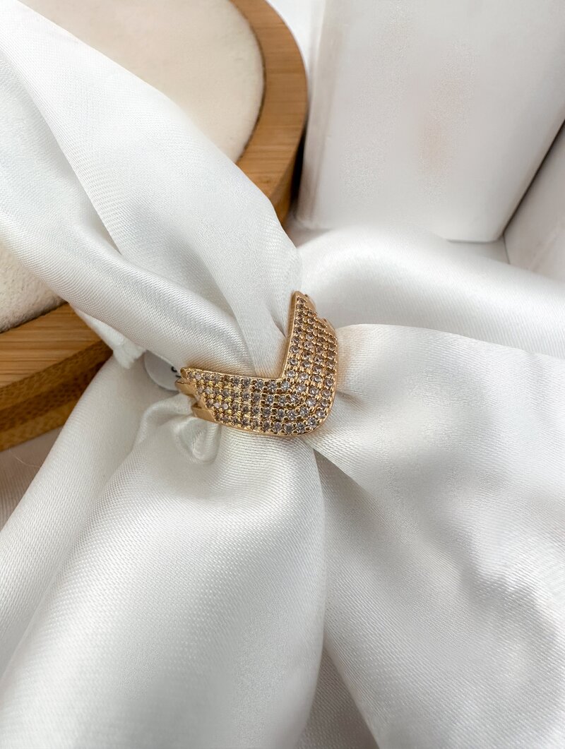 3. Anel Folheado a Ouro 18k e Prata Design V Cravejado