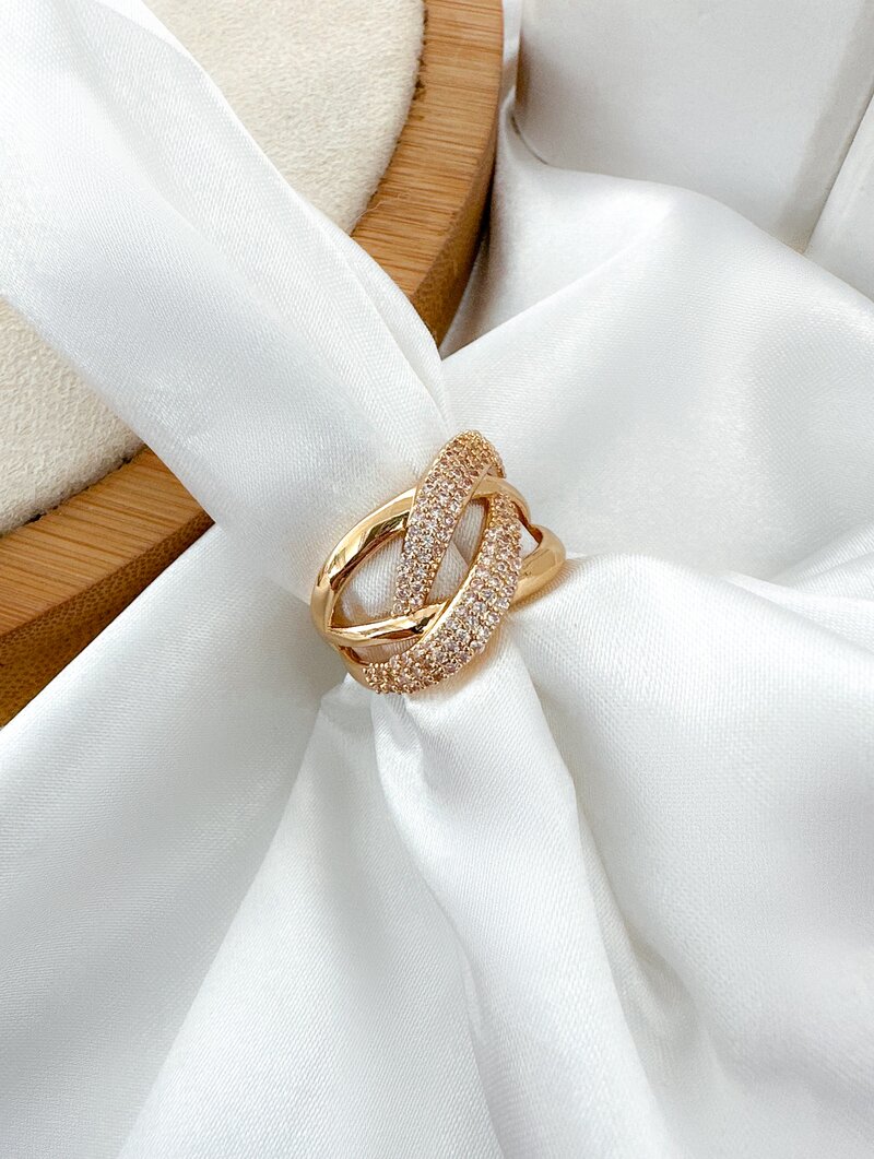 anel folheado a ouro 18k e prata fios vazados cravejados