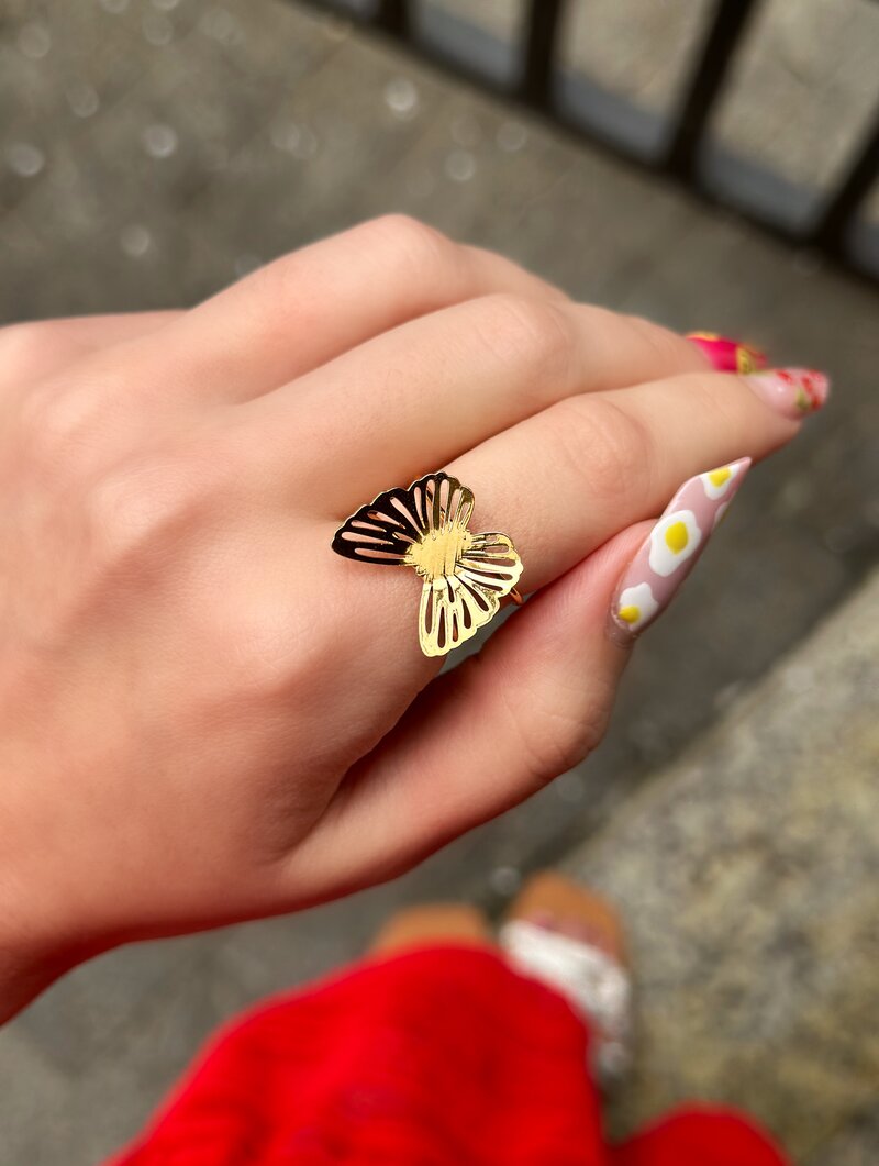 3. Anel Folheado a Ouro 18k Regulável Borboleta com Detalhe Vazado