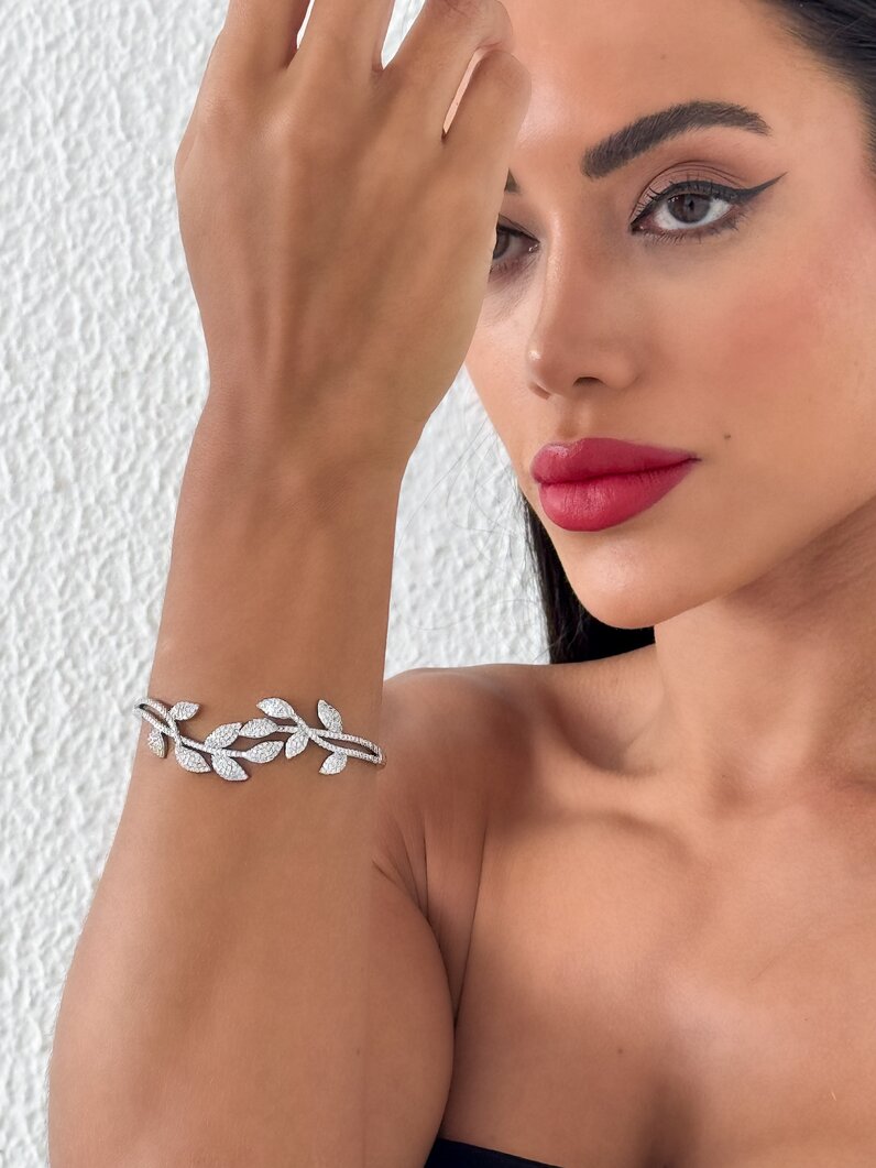 3. Bracelete Folheado a Ouro 18k e Prata 925 Design de "Galho de Folhas" Cravejados