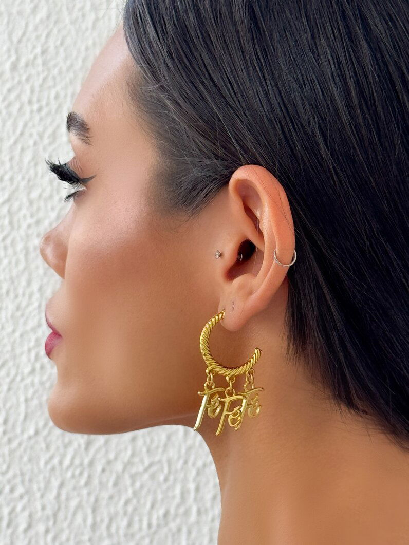 3. Brinco argola escovada com pingente escrita FÉ