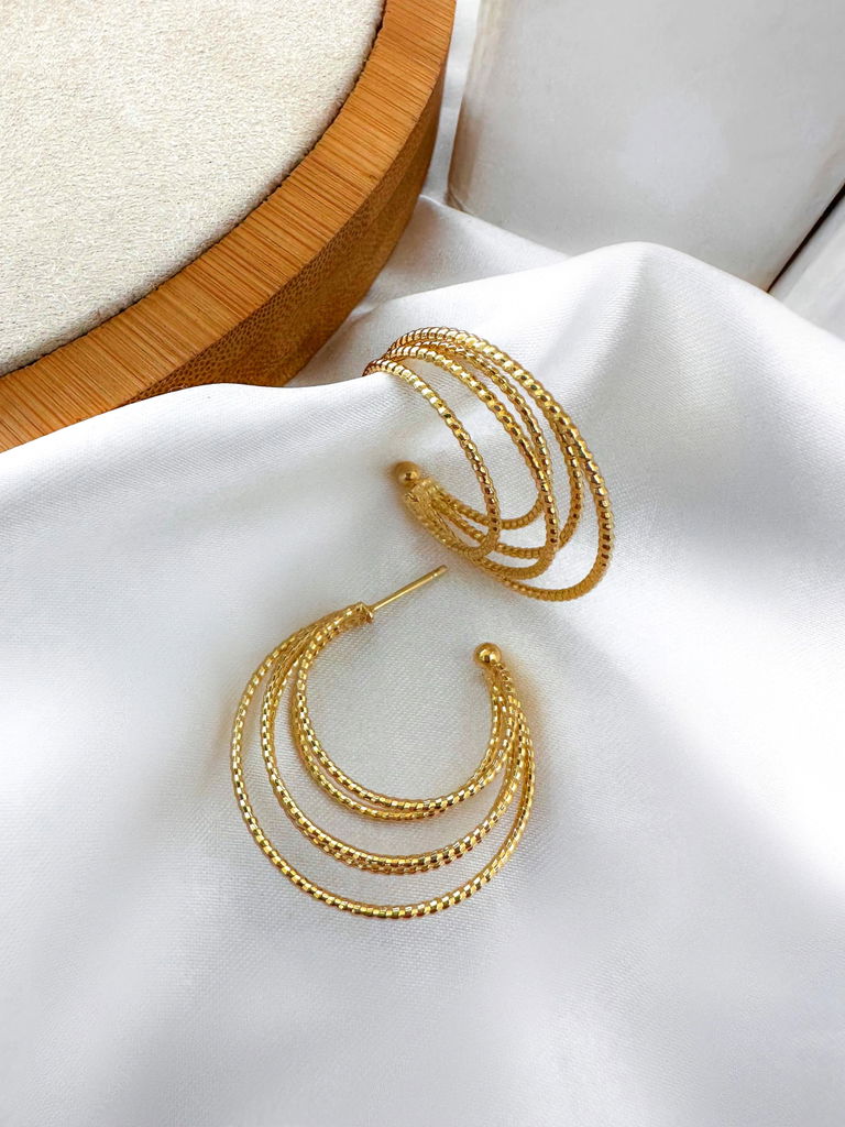 2. Brinco argola folheado a ouro 18k cinco fios com textura.