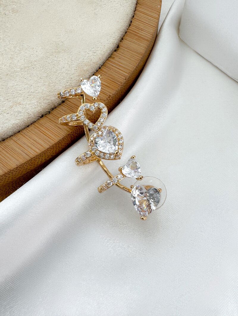 3. Brinco Ear Cuff Folheado a Ouro 18k Corações de Zircônias