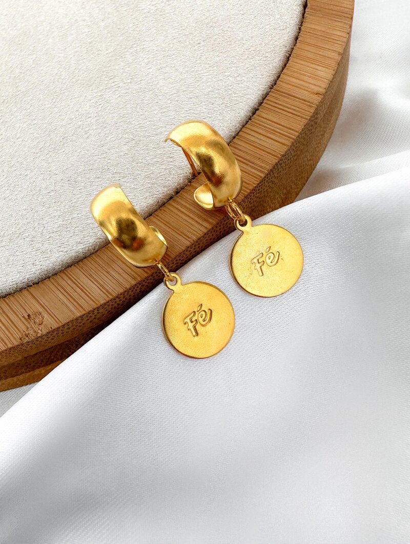 Brinco Folheado a Ouro 18k Argolinha com Pingente Fé