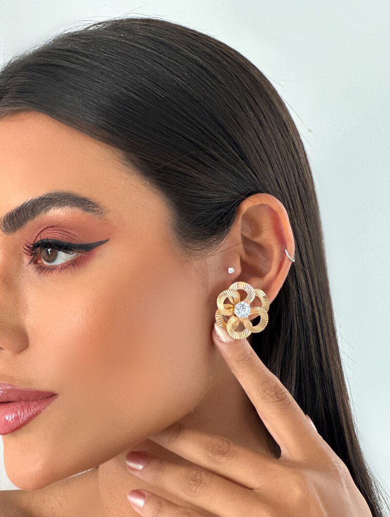 3. Brinco Folheado a Ouro 18K e a Prata Flor Petalas Vazadas com Pedra de Zirconia