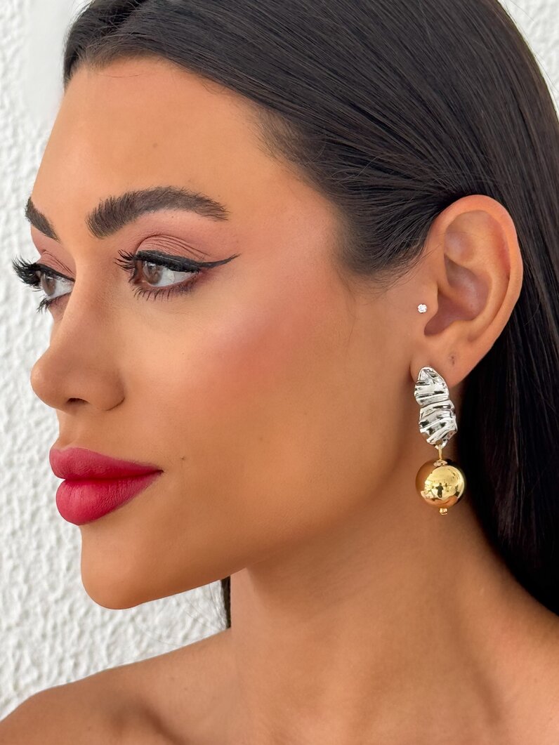 Brinco Folheado a Ouro 18k e Prata, Mix Banho Ponteira Orgânico Com Esferas