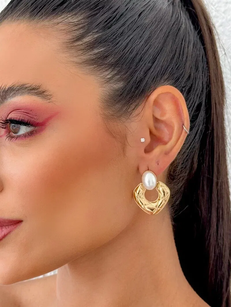 3. Brinco Folheado a Ouro 18k e Prata Argola Trabalhada com Pérola