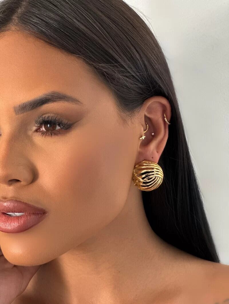 Brinco Folheado a Ouro 18K e Prata Circulos Botton Listrado Vazados