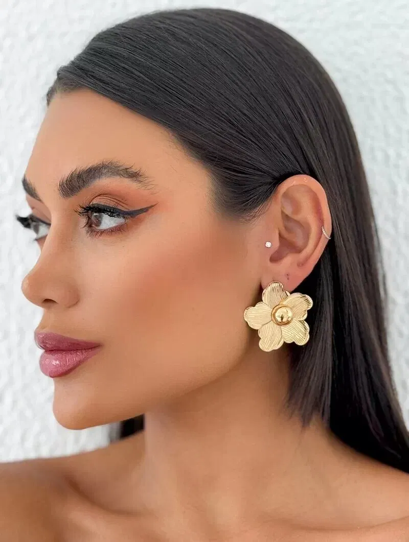 3. Brinco Folheado a Ouro 18k e Prata Flor Cinco Pétalas Texturizadas