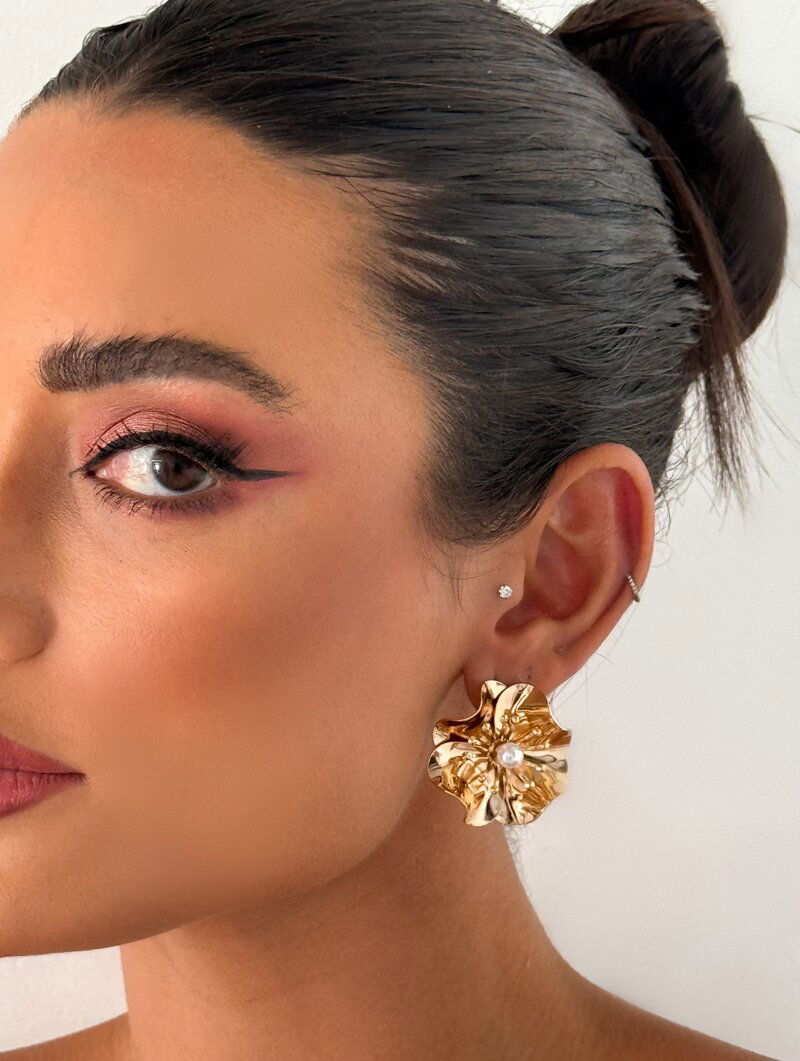 3. Brinco Folheado a Ouro 18k e Prata Flor Martelada com Pérola