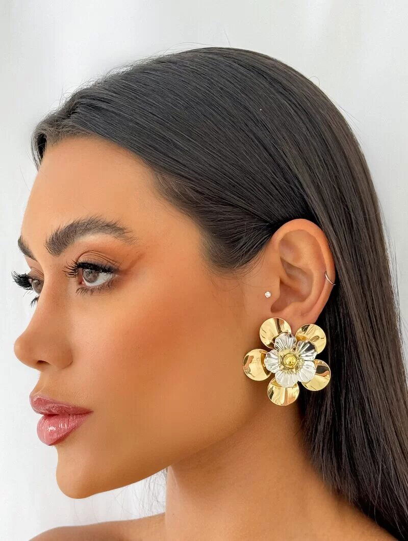 3. Brinco Folheado a Ouro 18k e Prata Flor Mix Banho Duas Camadas