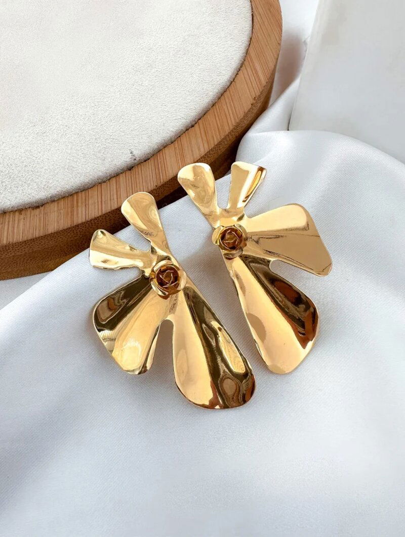 BRINCO FOLHEADO A OURO 18K E PRATA FLOR PERFIL QUATRO PÉTALAS