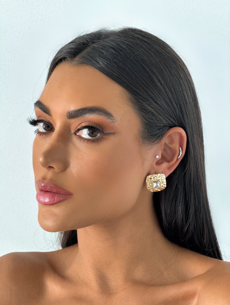 3. Brinco Folheado a Ouro 18k e Prata Quadrado Texturizado com Zircônia Central