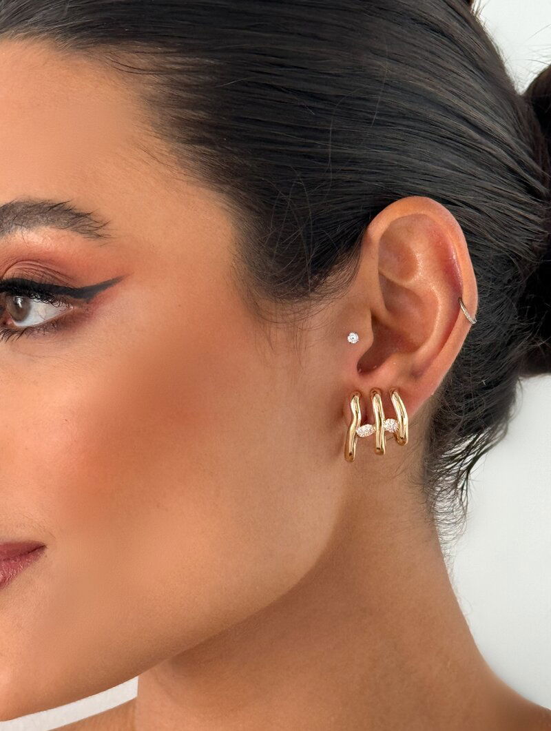 3. Brinco Folheado a Ouro 18k e Prata Três Fios com Entremeios Cravejados