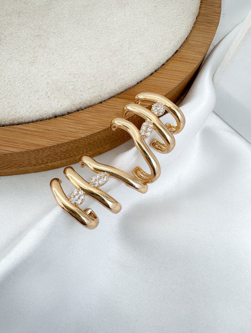 3. Brinco Folheado a Ouro 18k e Prata Três Fios com Entremeios Cravejados