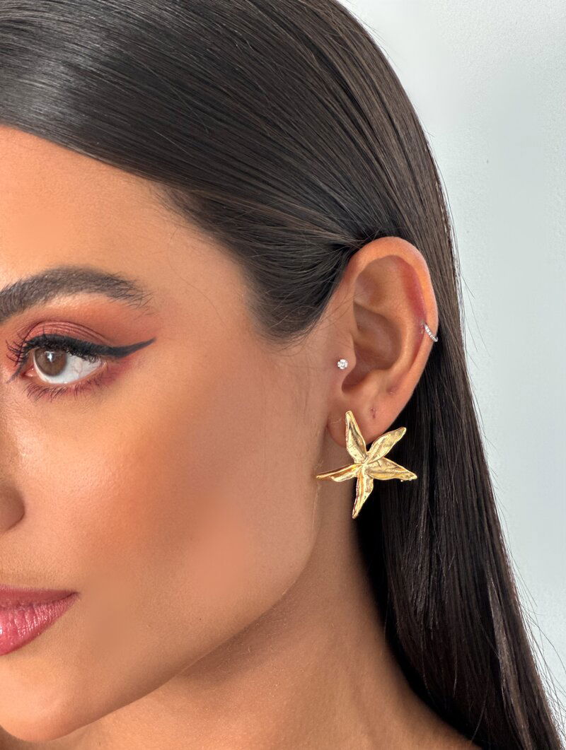 3. Brinco Folheado a Ouro 18k Flor Cinco Pétalas Marteladas
