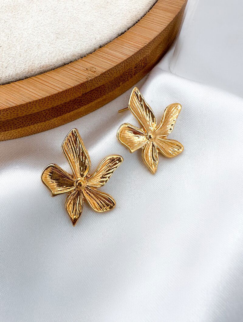 3. Brinco Folheado a Ouro 18k Flor Cinco Pétalas Marteladas