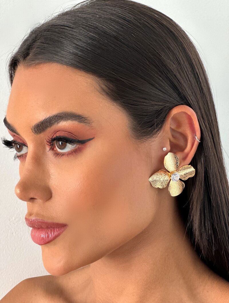 3. Brinco Folheado a Ouro 18K Flor Texturizada com Pedra de Zirconias