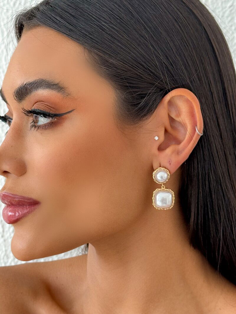Brinco Folheado a Ouro 18k Pérolas Formatos Geométricos com Borda Trançada