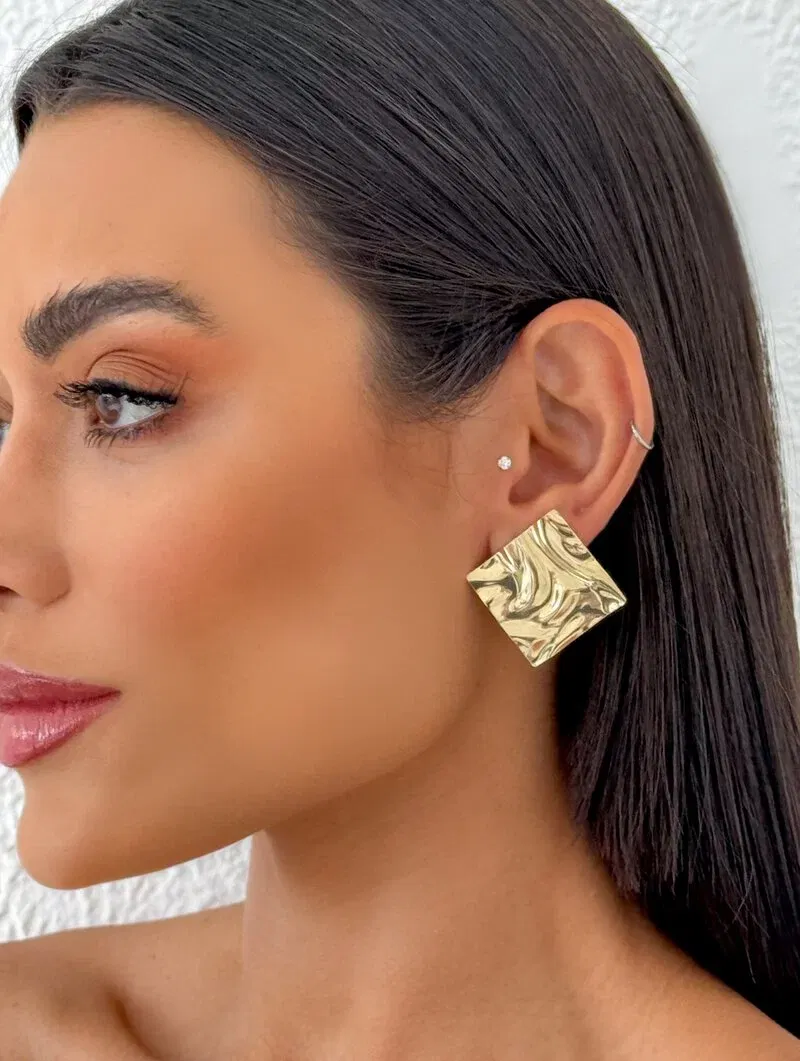 Brinco Folheado a Ouro 18k Quadrado Martelado Liso