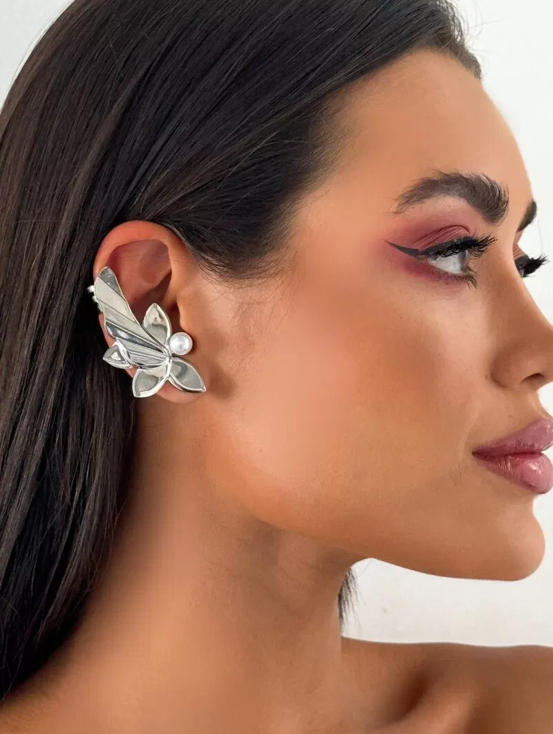 3. Brinco Folheado a Prata Flor Perfil Cinco Pétalas com Pérola