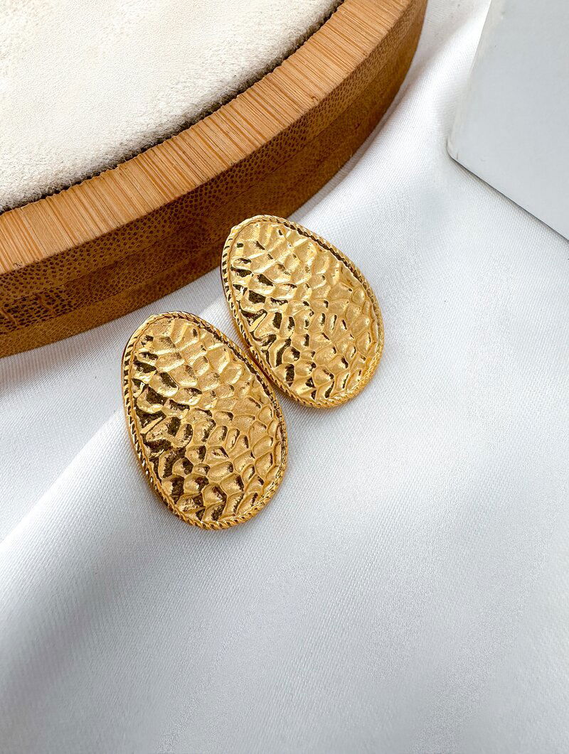 Brinco Folheadp a Ouro 18k Botton Oval Martelado