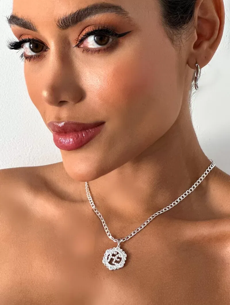 2. Colar corrente com pingente bordado escrita Fé com pontos de micro zircônia.