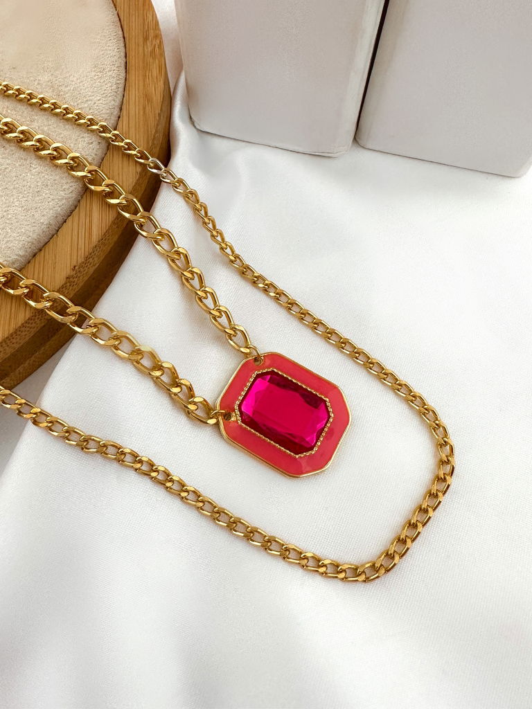 3. Colar corrente dois fios com pingente quadrado esmaltado e pedra cristal folheado a ouro 18k