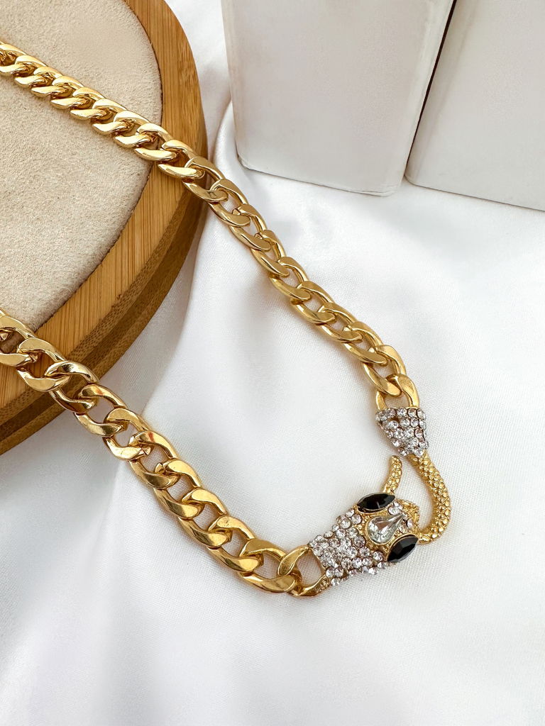Colar corrente elo com meio de serpente em zircônias folheado a ouro 18k