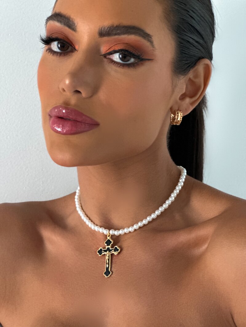 Colar de perolas com crucifixo madre perola