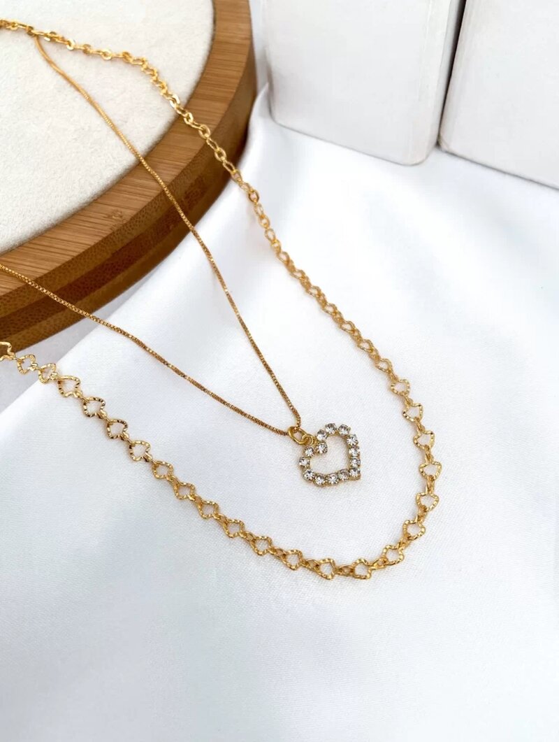 2. Colar dois fios folheada a ouro com pingente de coração bordas em micro zircônias