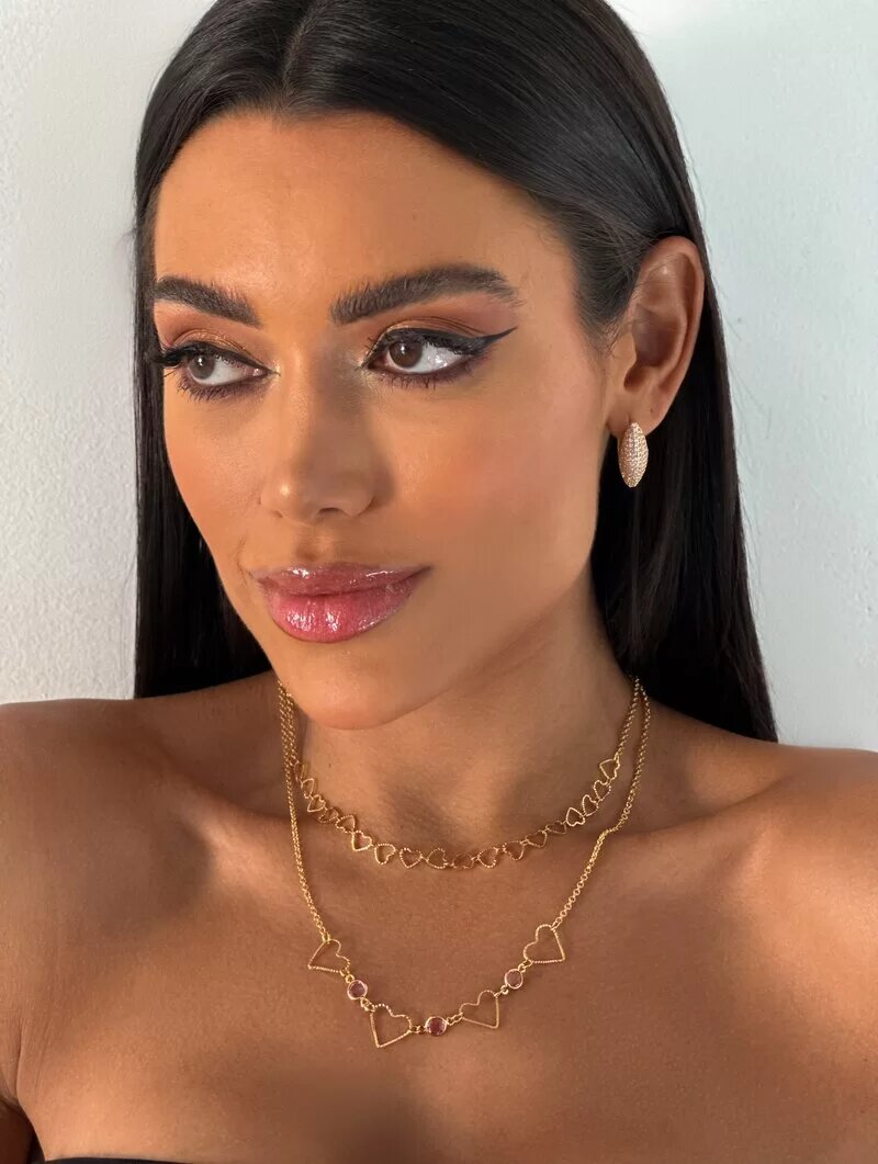 3. colar dois fios folheado a ouro 18k com corações vazados e ponto de luz rosa.