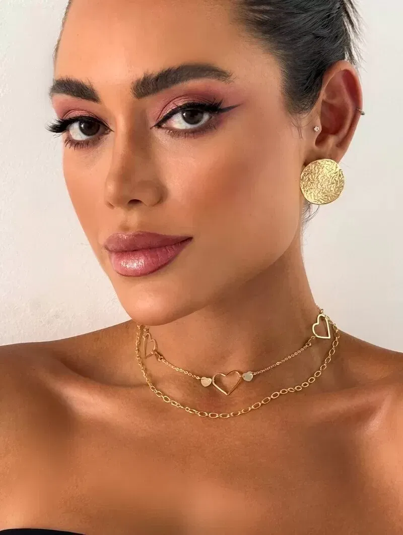 3. Colar Dois Fios Folheado a Ouro 18k Corrente Elos com Corações