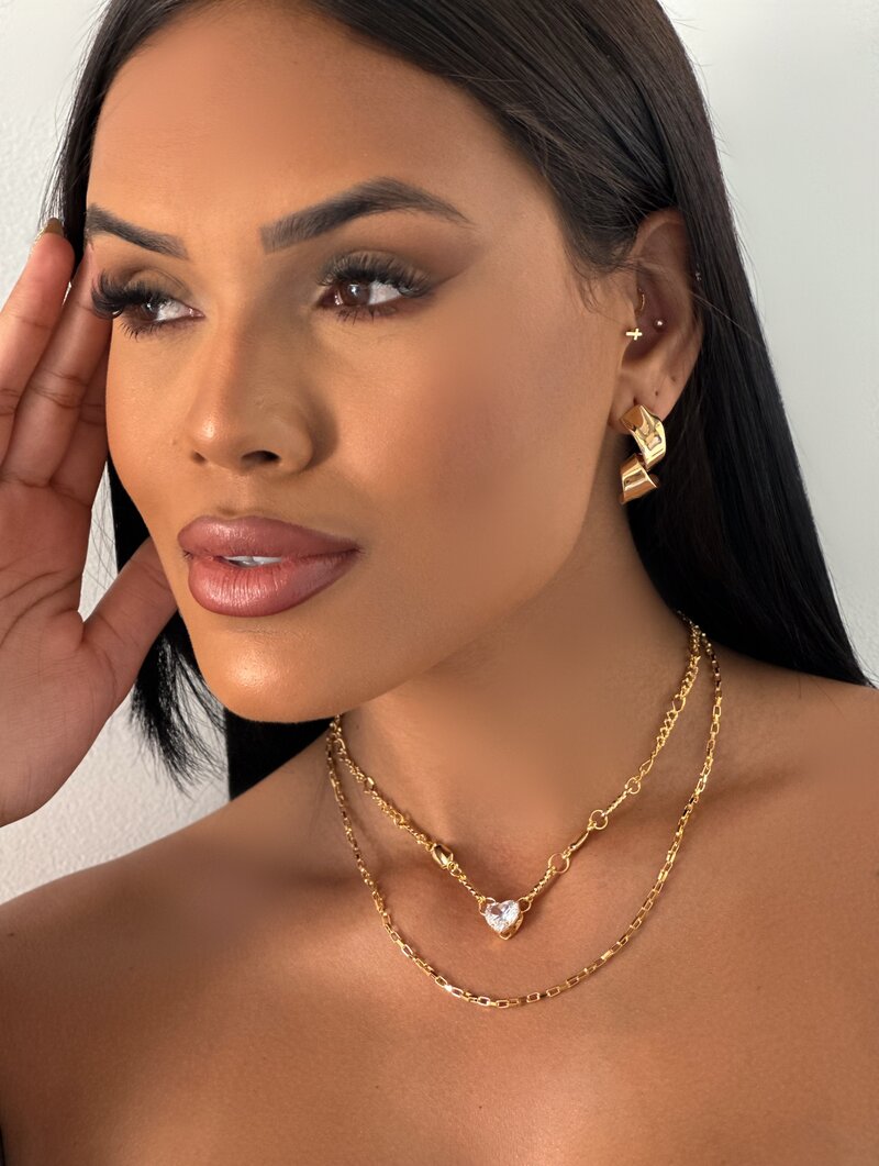 Colar Dois Fios Folheado a Ouro 18k Corrente Quadrada com Coração de Zircônia