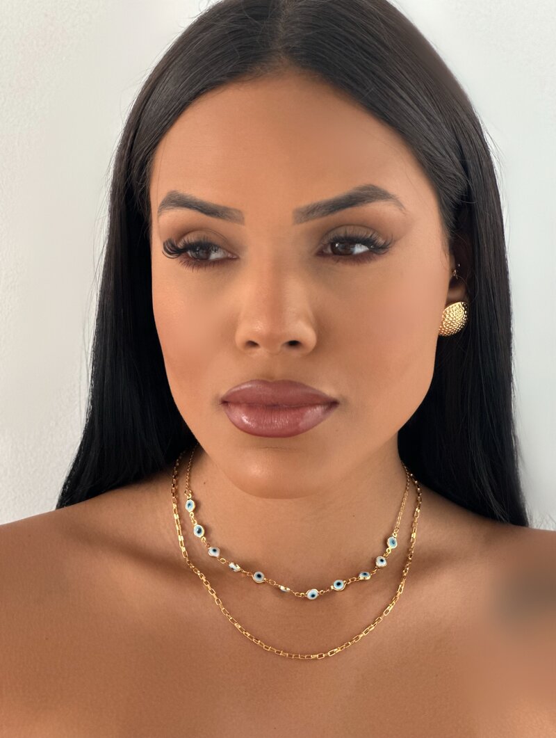 3. Colar Dois Fios Folheado a Ouro 18k Corrente Quadrada com Olho Grego