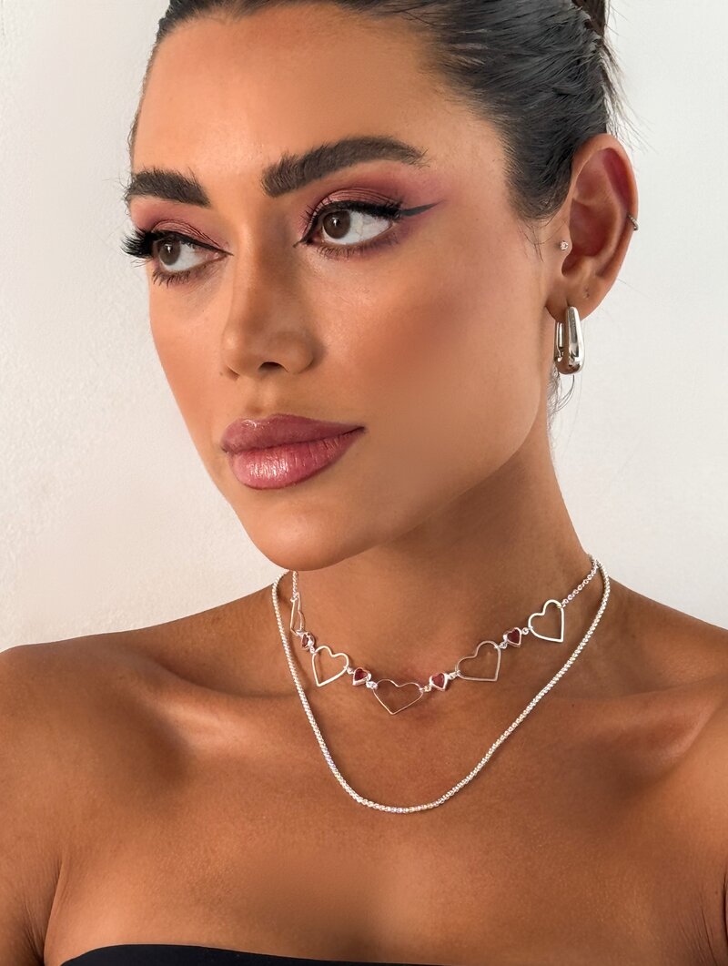 3. Colar Dois Fios Folheado a Prata 925 com Corações Vazados e de Zircônias