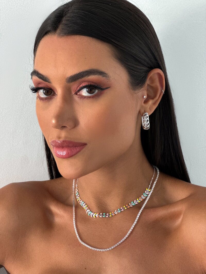 Colar Dois Fios Folheado a Prata 925 Fio de Micro Zircônias e Escamas Coloridas