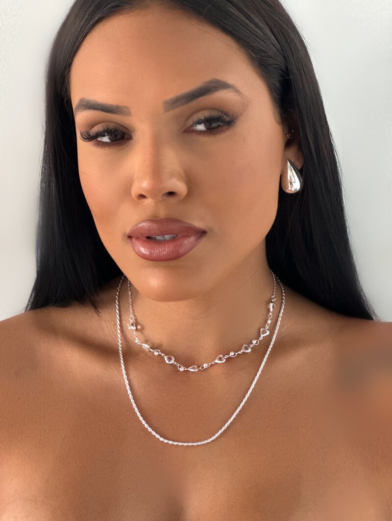 3. Colar Dois Fios Folheado a Prata Cordão Baiano com Corações Cristais e Mini Pérolas
