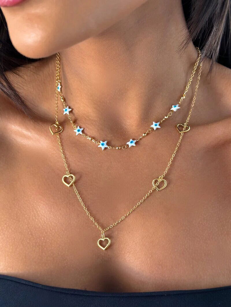 2. Colar duplo corações e estrelinhas olho grego folheado a ouro 18k .