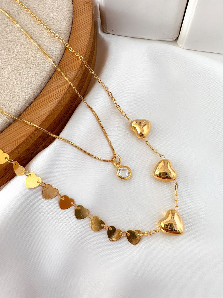 Colar duplo folheado a ouro 18k com coração e ponto de luz.