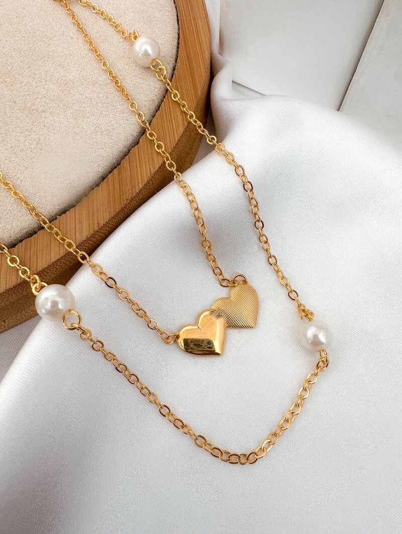 Colar Duplo Folheado a Ouro 18k Coração Duplo com Pérola