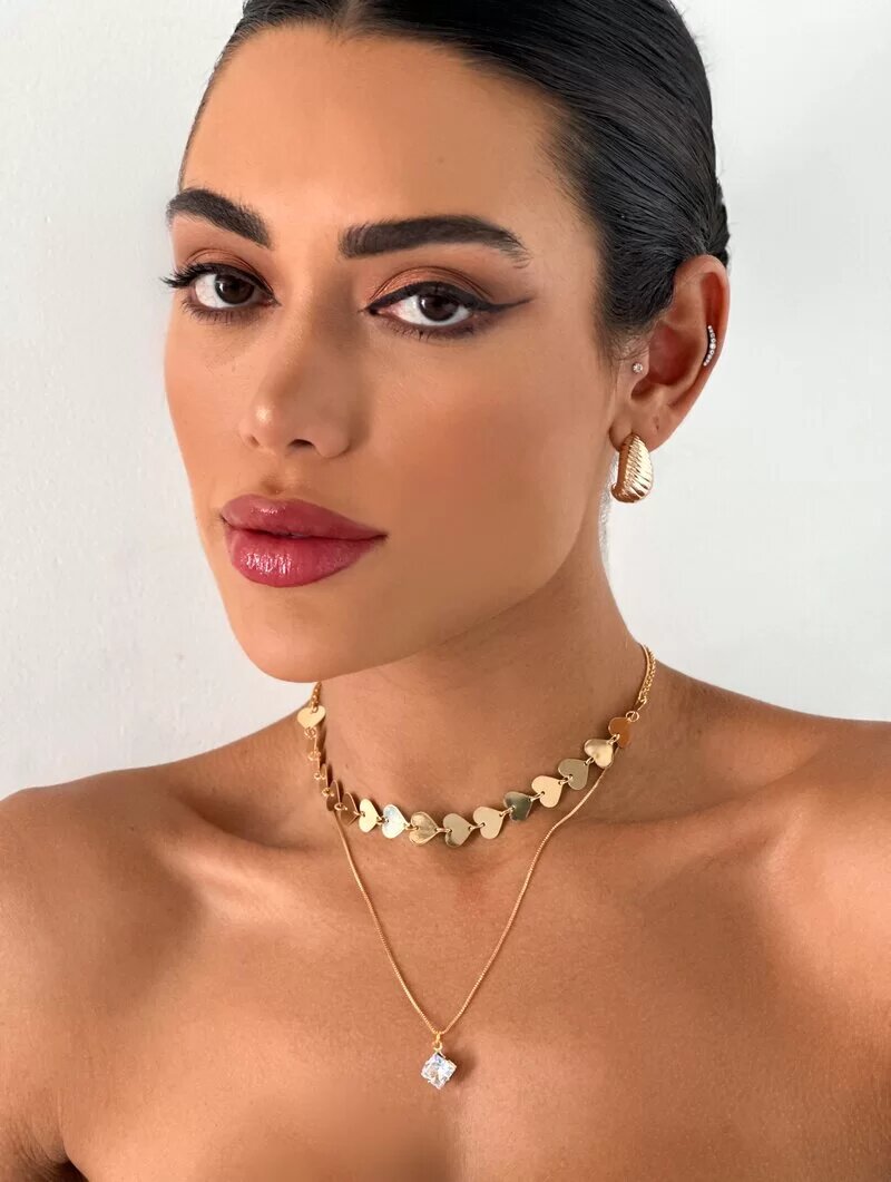 3. Colar Duplo Folheado a Ouro 18k Corações Lisos com Pedra de Zircônia