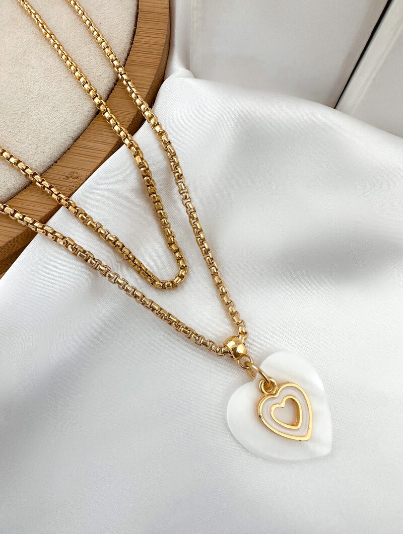 Colar Duplo Folheado a Ouro 18k Corrente Quadrada com Coração Madrepérola