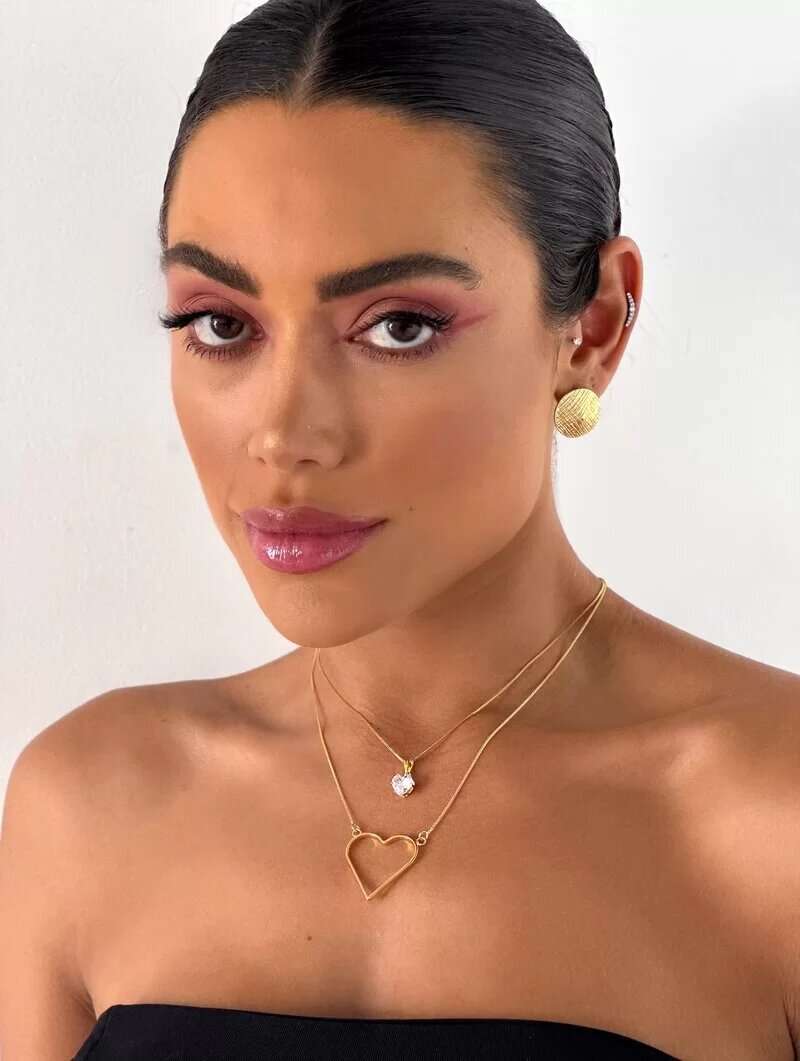 3. Colar Duplo Folheado a Ouro 18k e Prata 925 Coração Vazado com Zircônia