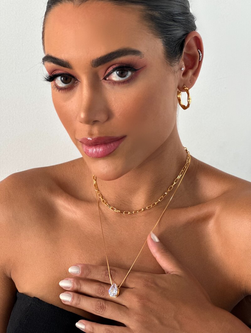 Colar Duplo Folheado a Ouro 18k e Prata 925 Elos com Corrente Fina e Gota de Zircônia