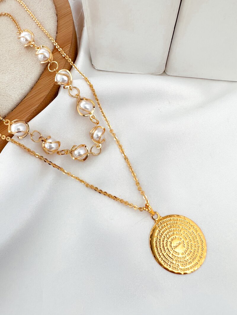colar duplo folheado a ouro 18k e prata 925 pérolas com pingente pai nosso