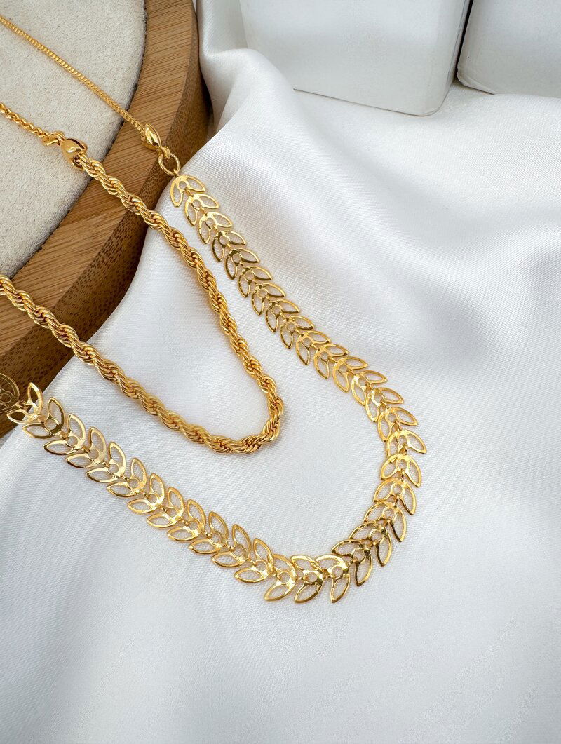 3. Colar Duplo Folheado a Ouro 18k Escamas Vazadas e Cordão Baiano