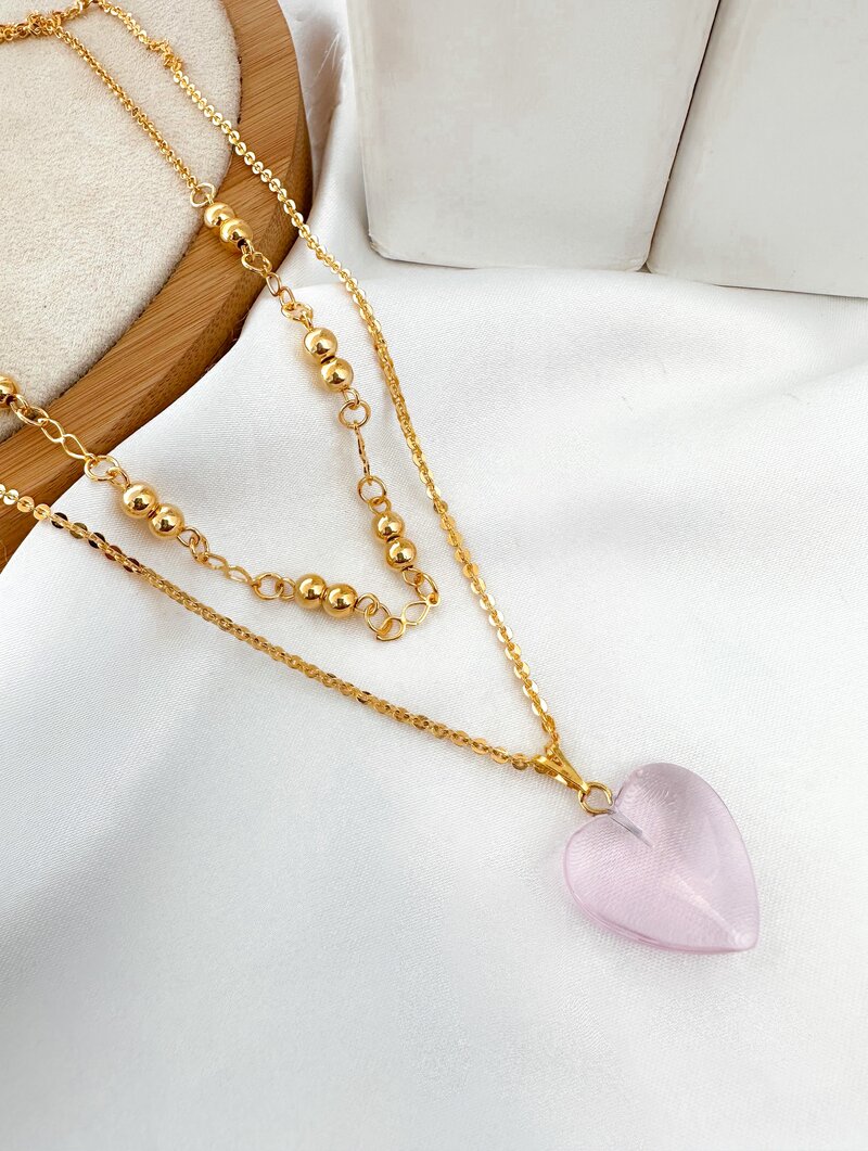 colar duplo folheado a ouro 18k esferas com coração cristal rosa