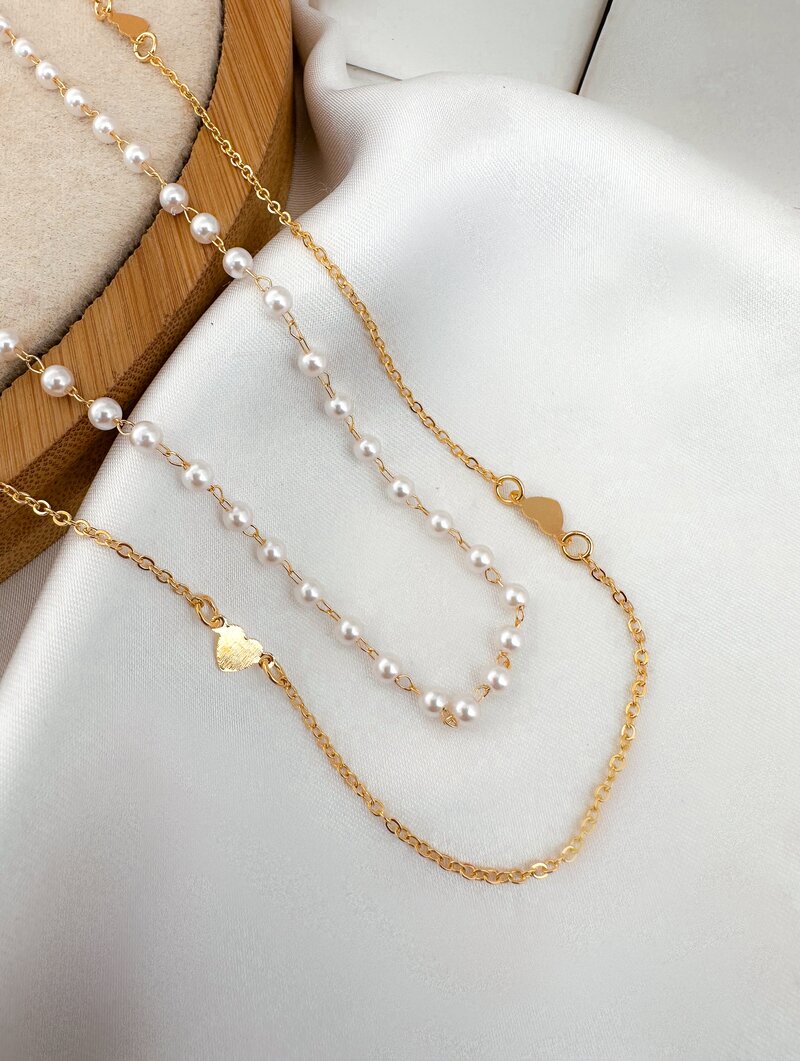 3. Colar Duplo Folheado a Ouro 18k Mini Pérolas com Corações