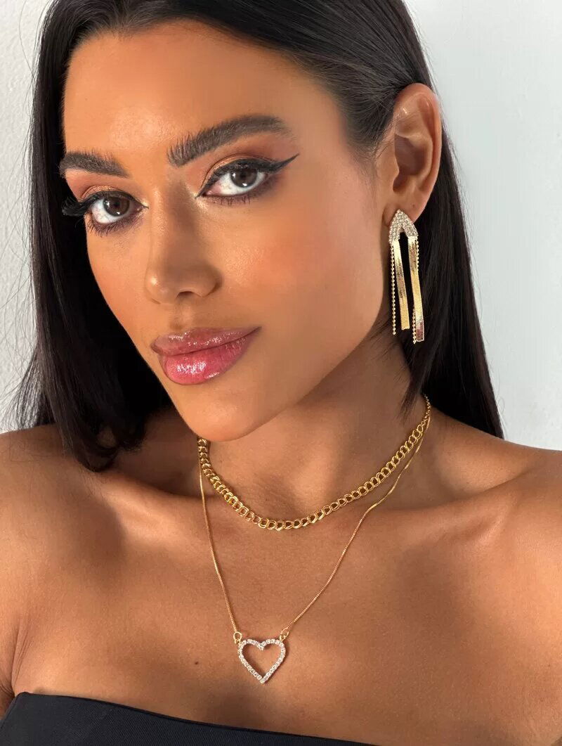 3. Colar Duplo Folheado a Ouro 18k Pingente Coração Vazado Cravejado